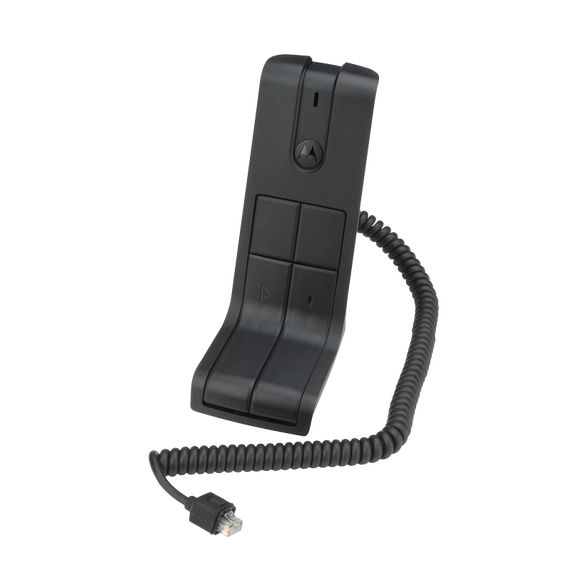 Black desktop microphone makes transmissions easy when the mobile radio is being used from a desktop because the microphone and push-to-talk button are larger. Microphone can help expedite transmissions because the user doesn't have to keep picking up the mobile microphone.