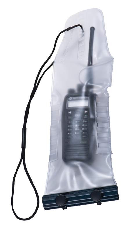 This waterproof bag fits any Motorola two-way radio and includes a convenient carrying strap.