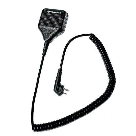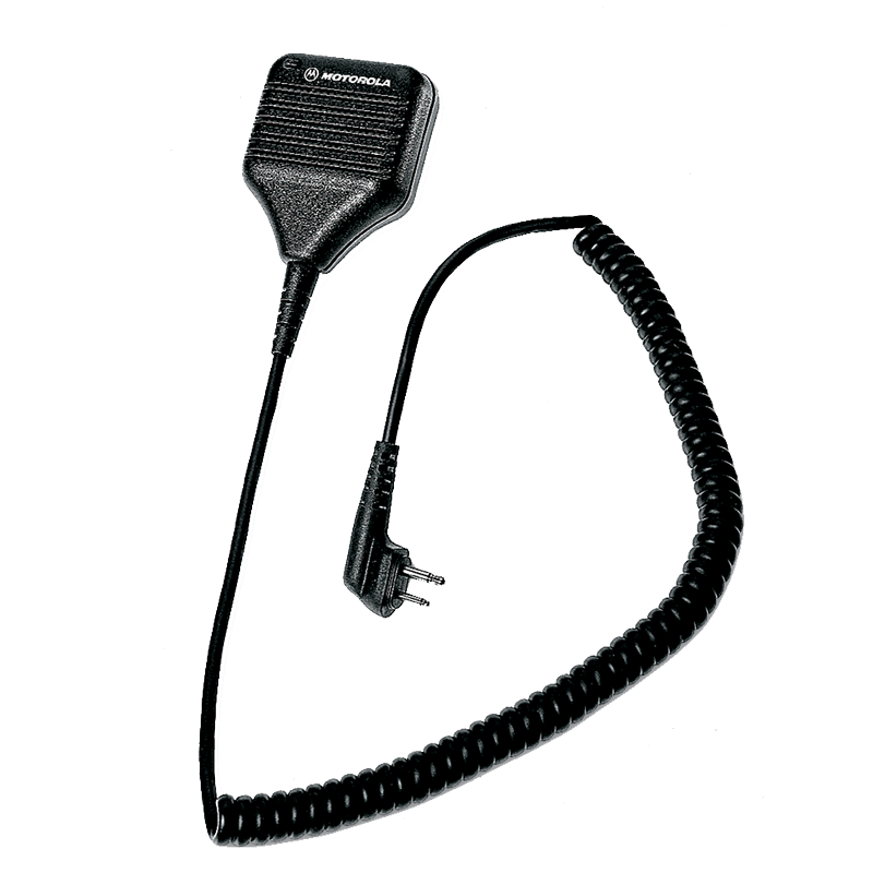 This compact remote speaker microphone is a water-resistant unit that allows talking and listening without removing the radio from the belt or case. It has a coiled cord and Push-to-Talk switch. A clothing clip on the microphone back clips securely onto a shirt or collar.