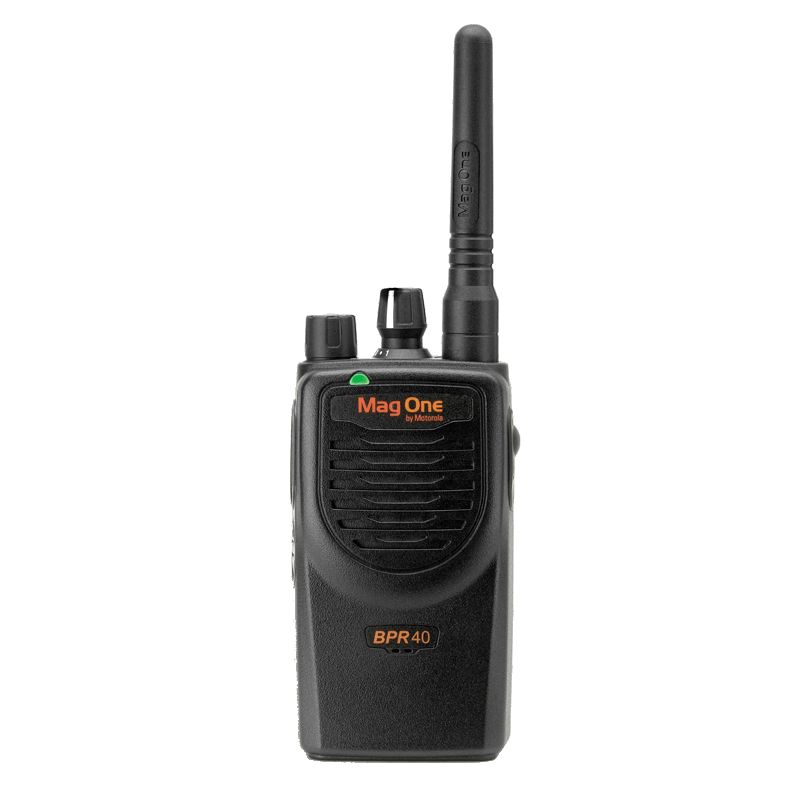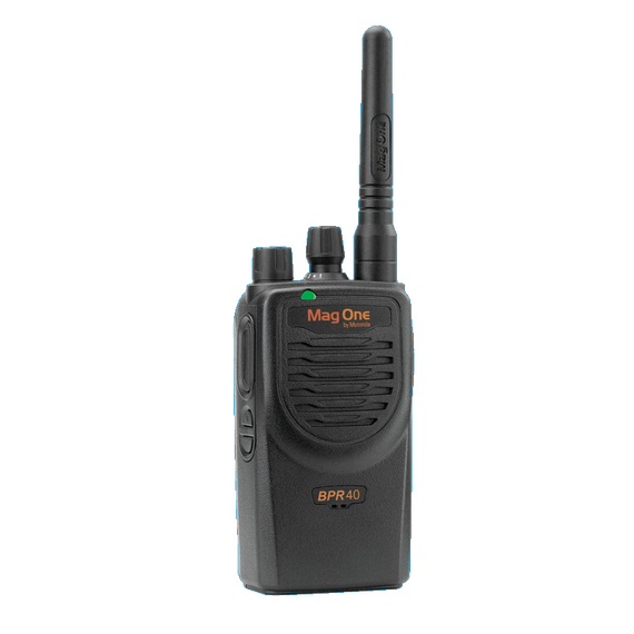 The Motorola BPR40 portable two-way radio delivers reliable, intuitive communication through 8 or 16 channels and 2 programmable buttons. The high-/low-power option saves battery charge. Features such as nuisance channel delete and repeater talkaround make the radio a versatile, high-performance device. The BPR40 is part of the Mag One by Motorola radio portfolio. This affordable solution gives remarkable quality and value that is perfect for your business, and comes with a complete assortment of accessories to customize your radio.